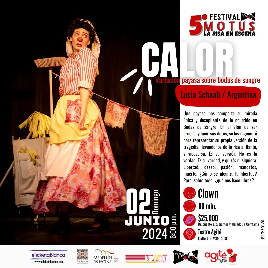 Las jornadas continuaron con destacadas obras como El Desclowncierto de La Clownmunidad (Cali), que abrió oficialmente el festival en el Teatro Gestos Mnemes, y La-Etitia de Edlanes Valeria (Bogotá), donde una recicladora transformaba objetos en mundos posibles a través de la risa. En la misma jornada, el festival también acogió La Anacoreta de Chalata Clown (Ecuador), una reflexión sobre la búsqueda de ligereza de su protagonista, Clavija Posponia. El domingo 2 de junio, el público disfrutó de El Clownjuro, de Agité Teatro, una propuesta propia que combinó suspenso y humor, mientras que el lunes 3 de junio se presentó CALOR, Variación payasa sobre Bodas de Sangre de Lucía Schaab (Argentina), una adaptación de la tragedia lorquiana llevada al terreno del humor.