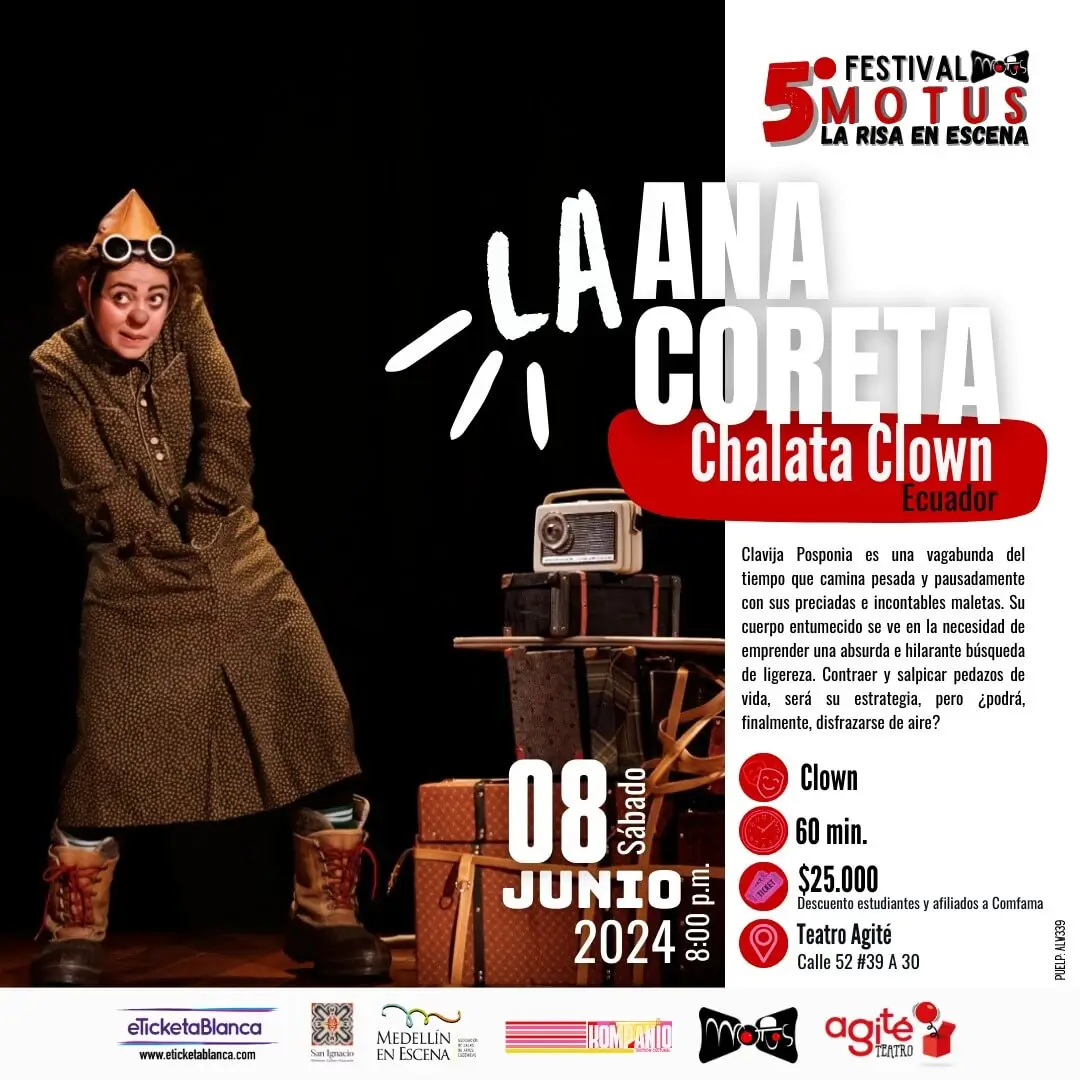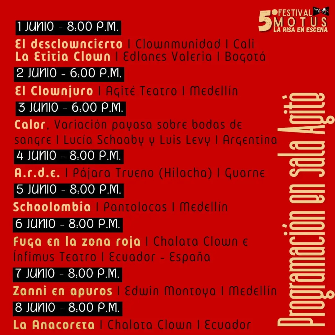 El Festival MOTUS V – La Risa en Escena 2024, que tuvo lugar del 31 de mayo al 8 de junio en Medellín, celebró su quinta edición con una propuesta vibrante y llena de creatividad, bajo el lema “Motus”, el movimiento continuo del alma, reflejando el espíritu dinámico que caracteriza este evento. Organizado por Agité Teatro, el festival se consolidó como un referente cultural, reuniendo agrupaciones de Ecuador, España, Argentina, Cali, Bogotá, Guarne y Medellín, ofreciendo una variada y enriquecedora programación que incluyó 13 presentaciones en cinco salas de teatro: cuatro en Medellín y una en Bello.